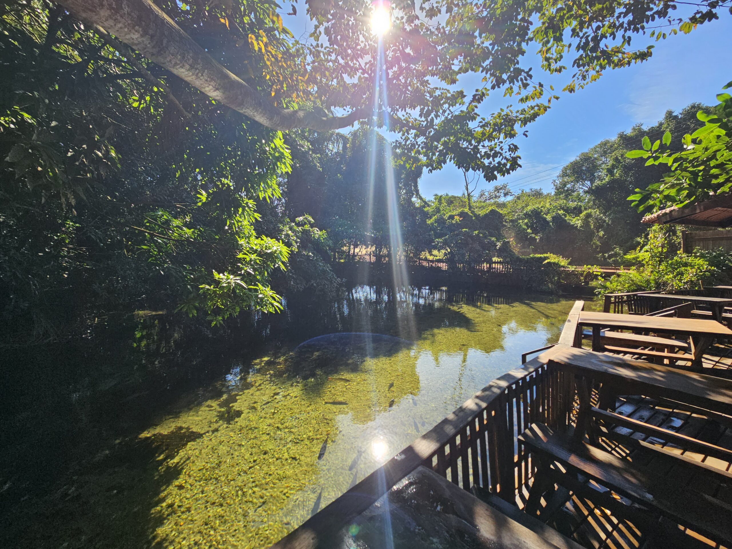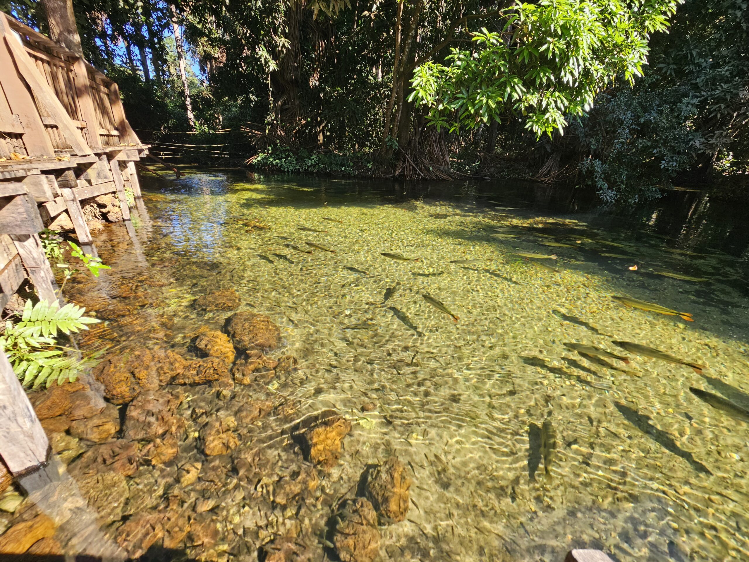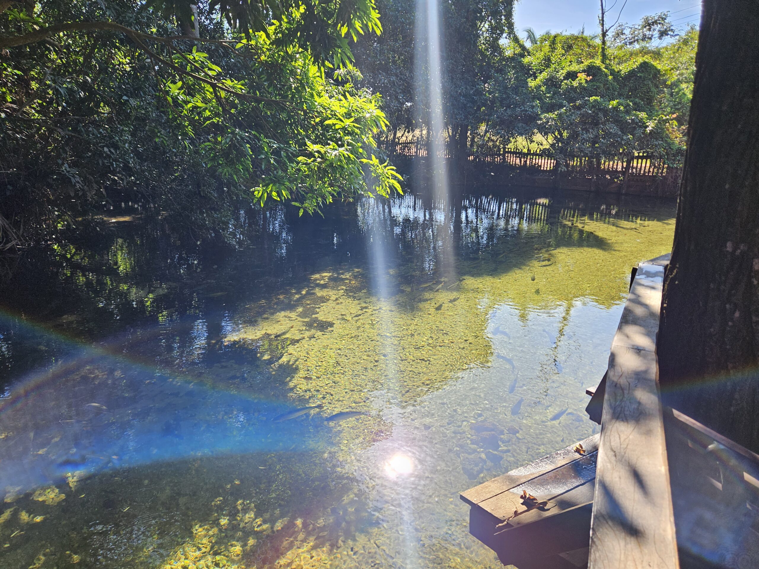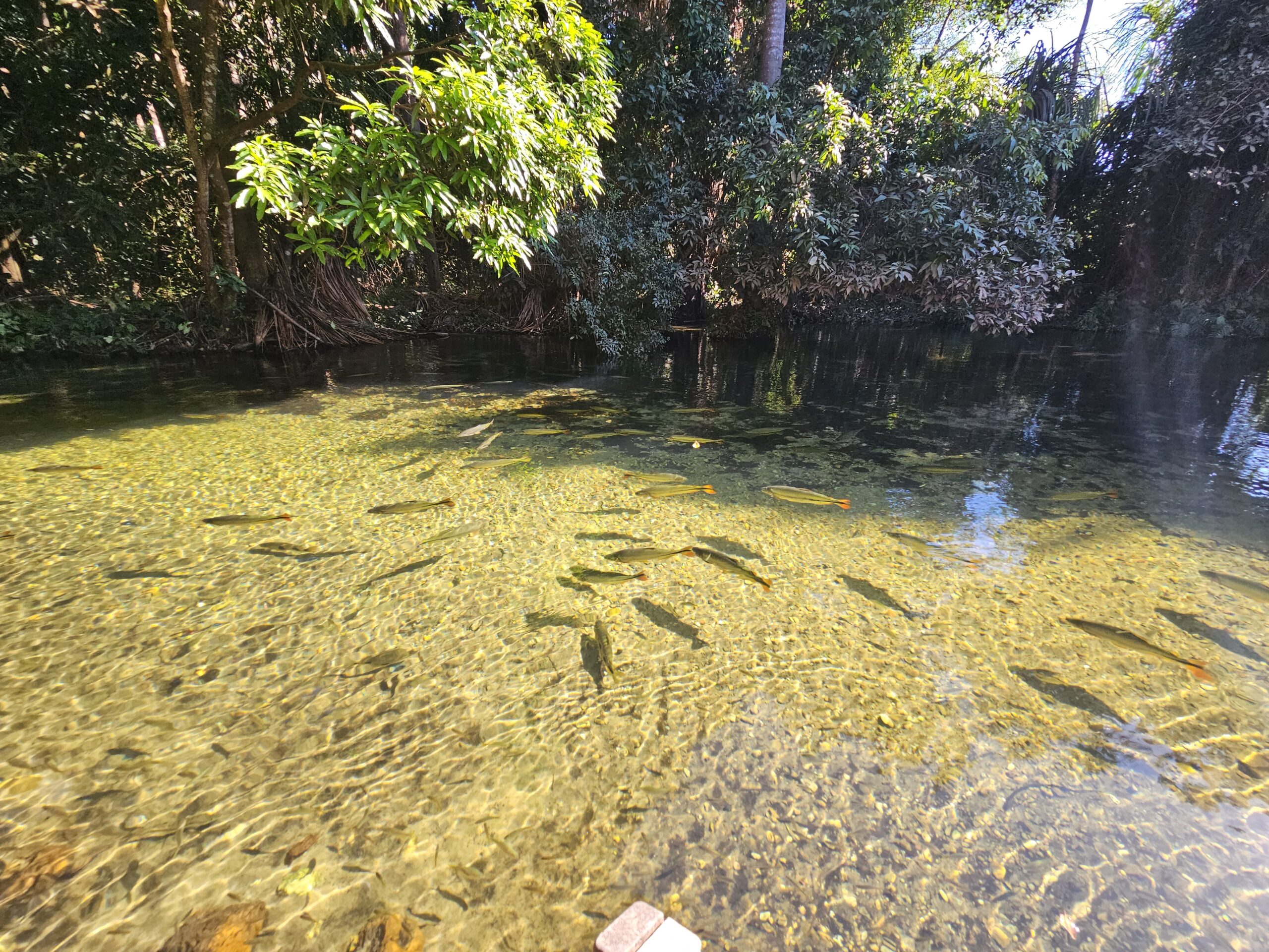 O grande destaque do balneário é o rio de águas extremamente cristalinas, que abriga uma verdadeira piscina natural cheia de peixes. É comum encontrar cardumes de dourados, piaus, pacus e piraputangas, proporcionando uma experiência única e divertida — impossível não se encantar!